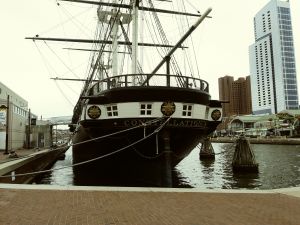 To get to the USS Constellation, enter through the museum, which is to the left of the ship, and obscured by it in this photo.